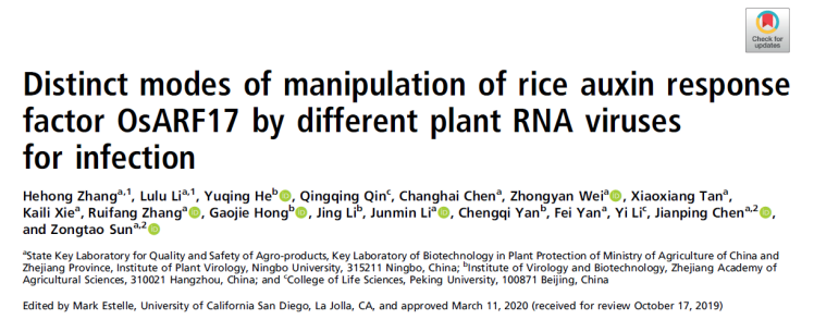 近日,国际著名学术期刊PNAS在线发表了久久精品一区二区植物病毒学研究所陈剑平院士研究团队的一项重要创新研究成果,题为《Distinct modes of manipulation of rice auxin response factor OsARF17 by different plant RNA viruses for infection》,该研究揭示了不同类型植物RNA病毒靶向同一个寄主抗病毒因子,干扰其功能从而促进病毒侵染的新机制。